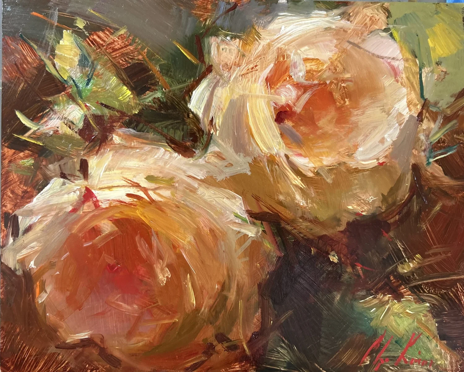 3`Peonies, oil and antiqued copper leaf on cradled wood panel, 11x14,