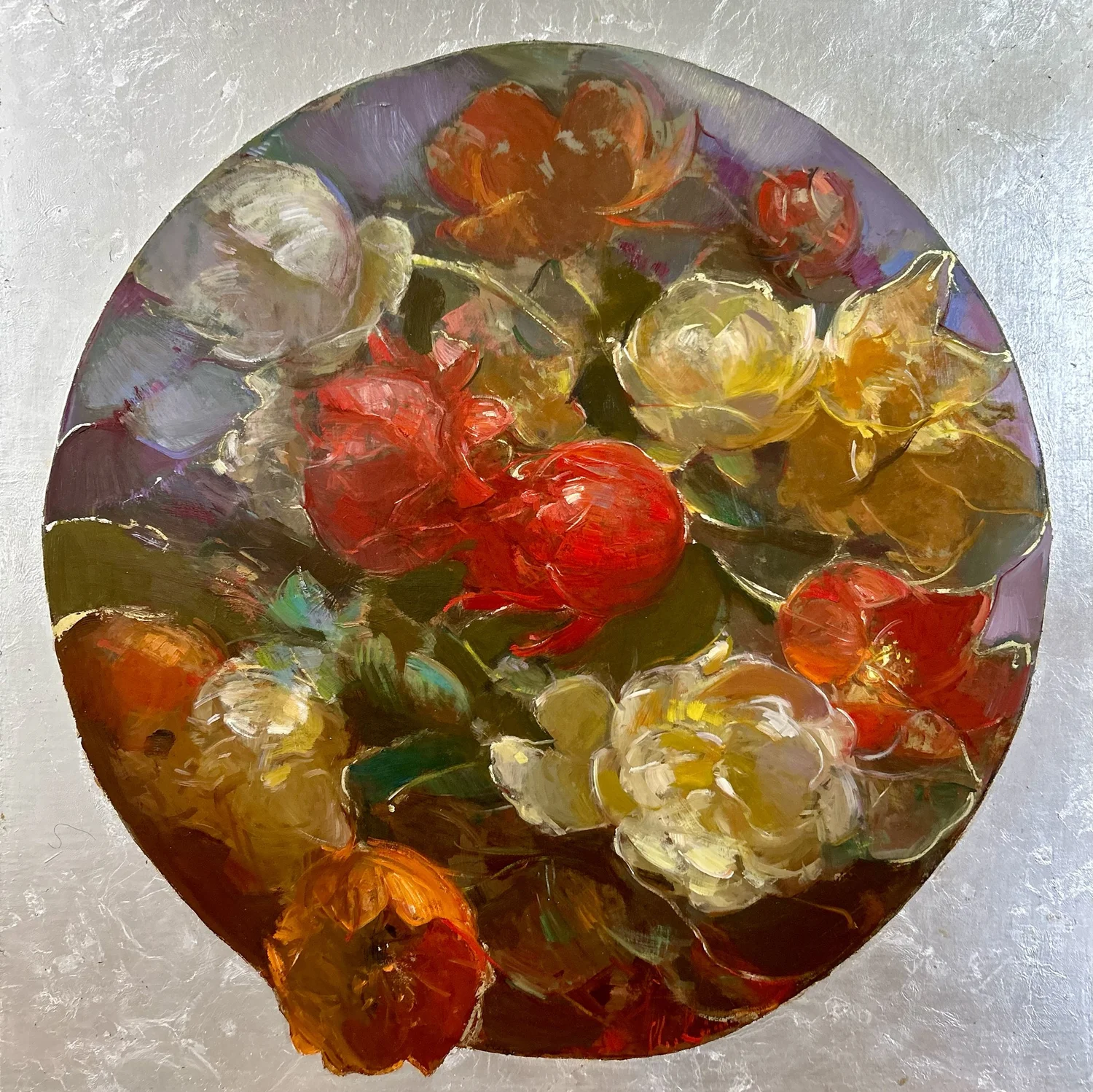 Tondo - Peonies in Silver And Gold, oil with 22K gold and silver leaf on Belgian linen, 30x30 inches